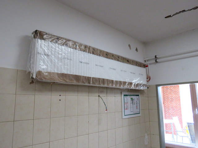 montiert. In den Sanitärräumen werden neue Leitungen verlegt und Heizkörper