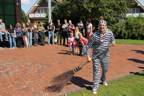 Nicht nur Helene Fischer hatte am 05. August, auch in Werdum wurde an diesem Tag groß gefeiert. "Jungbauer" Karsten Pieper beging seinen 30. Jahrestag und wie sich das in Ostfriesland gehört musste der noch unverheiratete junge Mann eine ziemliche Prozedur über sich ergehen lassen. Bereits am Vorabend hatten sich die Familie, Freunde und Bekannte allerhand einfallen lassen um auf den runden Geburtstag aufmerksam zu machen. Am Freitag dann fuhr um 14.00 Uhr der "Rasende Kalle" vor um das Geburstagskind zum traditionellen Fegen auf dem Dorfplatz zu fahren. Dort hatte seine Freudin Neele zusammen mit ihrem bruder Folp einiges vorbereitet. Zwischen den einzelnen Fegedisziplinen musste er z.B. Eier auf einem Löffel transportieren, einen Führerschein mit jahrgang 1986 präsentieren und die Eheringe von einem Ehepaar finden das mindestens 30 Jahre verheiratet ist. Mit viel Geschick und einer gewissen Lockerheit schaffte er alle Hürden und als dann Neele Becker nach einigen Verhandlungen sich bereit erklärte ihn frei zu küssen, hatte Karsten es geschafft. Zur großern Feier abends auf dem Ülkenhof trafen sich dann alle wieder und begossen den besonderen Tag ordentlich. |