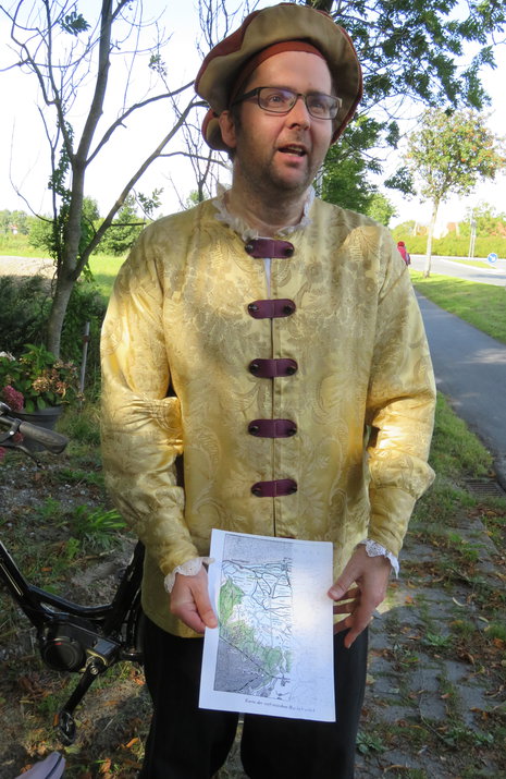 Worten auf dem Dorfplatz ein und war dann an den markantesten Punkten vor Ort und gab weitergebende Hinweise ab. Das erste Ziel, die Burg in Edenserloog war dann schnell erreicht. Dabei