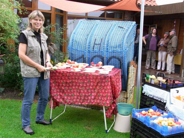 Süßigkeiten. Kostenproben von diversen Apfelsorten bot Marita Tjarks aus Anderwarfen, Spezialistin zum Thema „Äpfel“, an. |